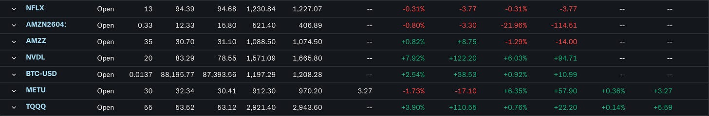 As communicated by the portfolio, I’m extremely bullish on AMZN—holding both the 2x leverage shares and a $240 April call. The call is not looking great with around 22% in the red. However, we have 4 months left for the underlying stock to increase close to 6% to be in the money (if worse comes to worse, the -50% stop loss will close the trade). But enough about the AMZN positions, allow me to explain why I’m bullish on them.