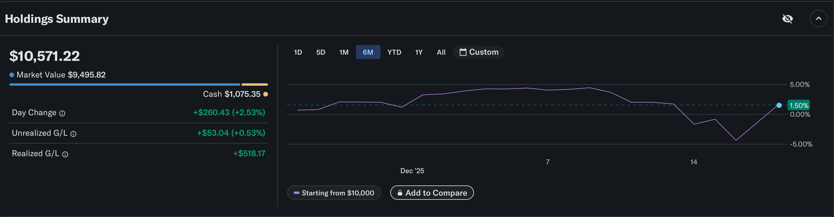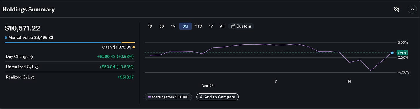 This week was a roller coaster for the portfolio. A very boring roller coaster—one sharp decline at the start of the week, and one another sharp increase at the end. Having our total portfolio value dip below our original balance of $10,000 briefly, before rising almost $200 higher than last week’s close at $10,571.17. The trades were few, but the conviction and optimism is plentiful.