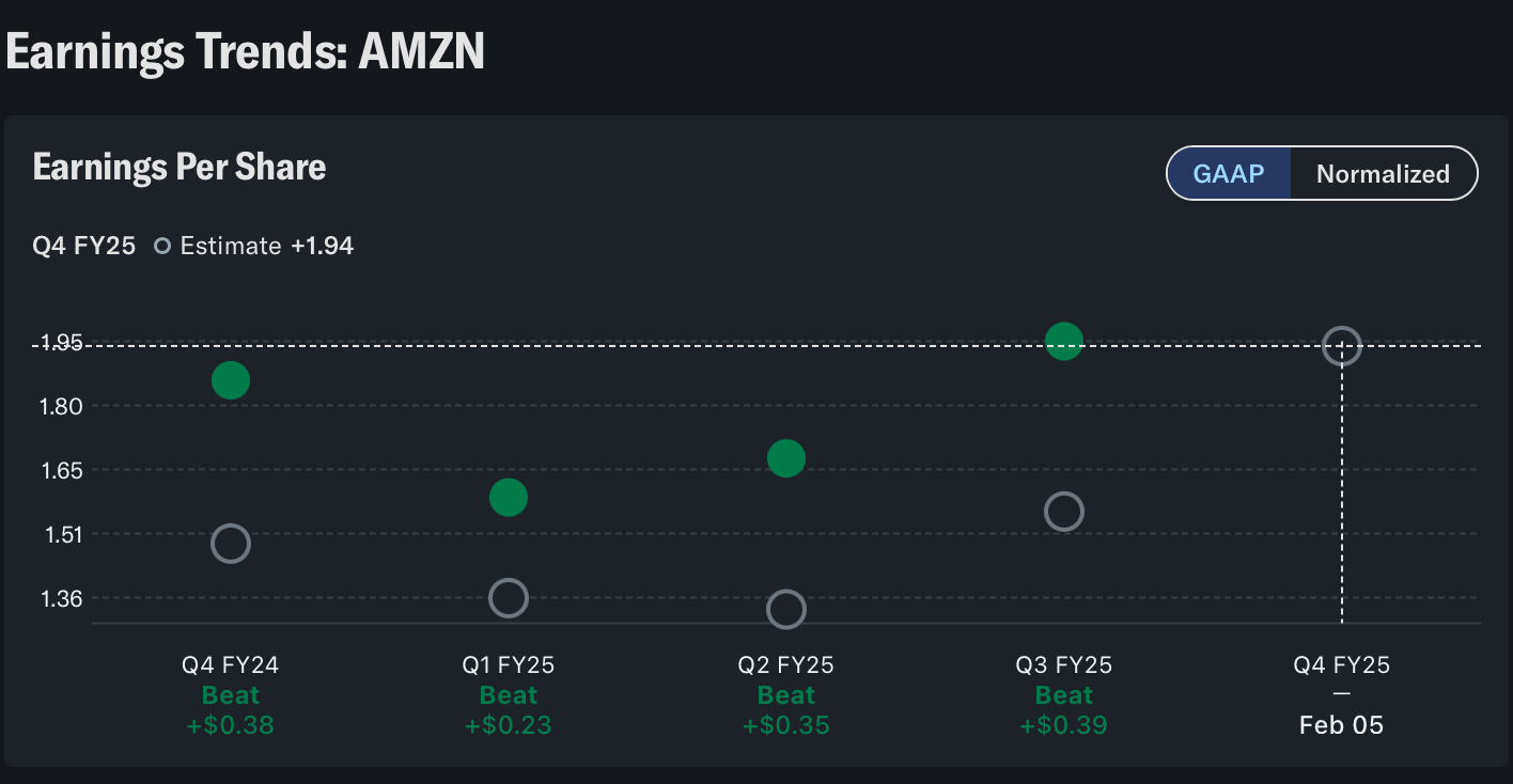 AMZN is setup to run wild in 2026. If we look at its profit printer, AWS (Amazon Web Services), the revenue rate is $130 billion annually. With margins bouncing in the low-to-mid 30s. Thus, carrying the EPS for AMZN’s shareholders, with expectations only growing because AMZN keeps beating them. Not to mention that the need for AWS is only going to continue growing with AI workloads scaling. This is why AMZN (and many other companies like it) are pouring heavy capex into new data centers and AI capacity. Many analyst agree with my conclusion with an average price target of $295.60 next year, the lowest of those being $245 of 67 different analyst. Below is AMZN’s past 4 EPS reports with their expectation in Q4, Feb 5, 2026.