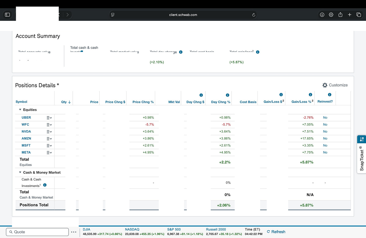In the second issue of Behind the Curtain, I’ll be brief because things are going my way. The portfolio is up 5.87% on cost basis and was up 2.10% today alone. This isn’t to brag — it’s to show how my real portfolio behaves in real time.