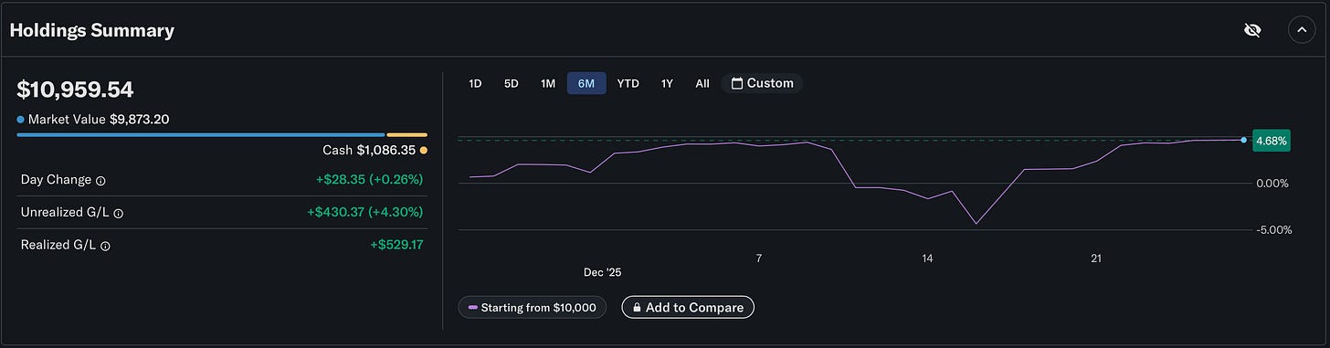 This week delivered the famous “Santa Claus rally” for the stock market, but for many investors the gains felt underwhelming compared to the hype. For our highly leveraged 10K portfolio, though, it was a quietly powerful stretch that did exactly what it was built to do. With no new trades and no forced action, the account took a modest market move and squeezed real performance out of it, thanks largely to our core leveraged exposure. The headline winner was NVDA, whose strong move drove outsized gains in our leveraged position, while an unsuspecting hero emerged in the AMZN call, shrinking its drawdown from a 22% deficit to roughly -10%. A week that most investors would ignore as “boring” is exactly the kind of week we’re going to celebrate.