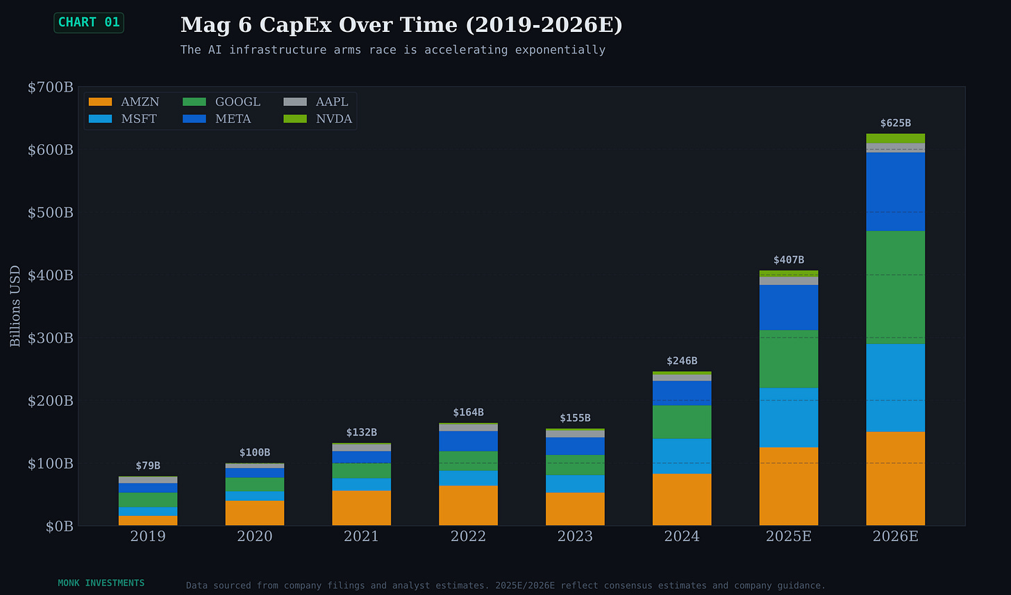 The thesis of this article revolves around the recent *capital expenditure "mega-cycle" within the Magnificent 7 (the seven biggest publicly traded companies). It's one of the most misunderstood investment stories on Wall Street—and apparently, even Buffett's framework can't see it. One company in particular proves exactly why.