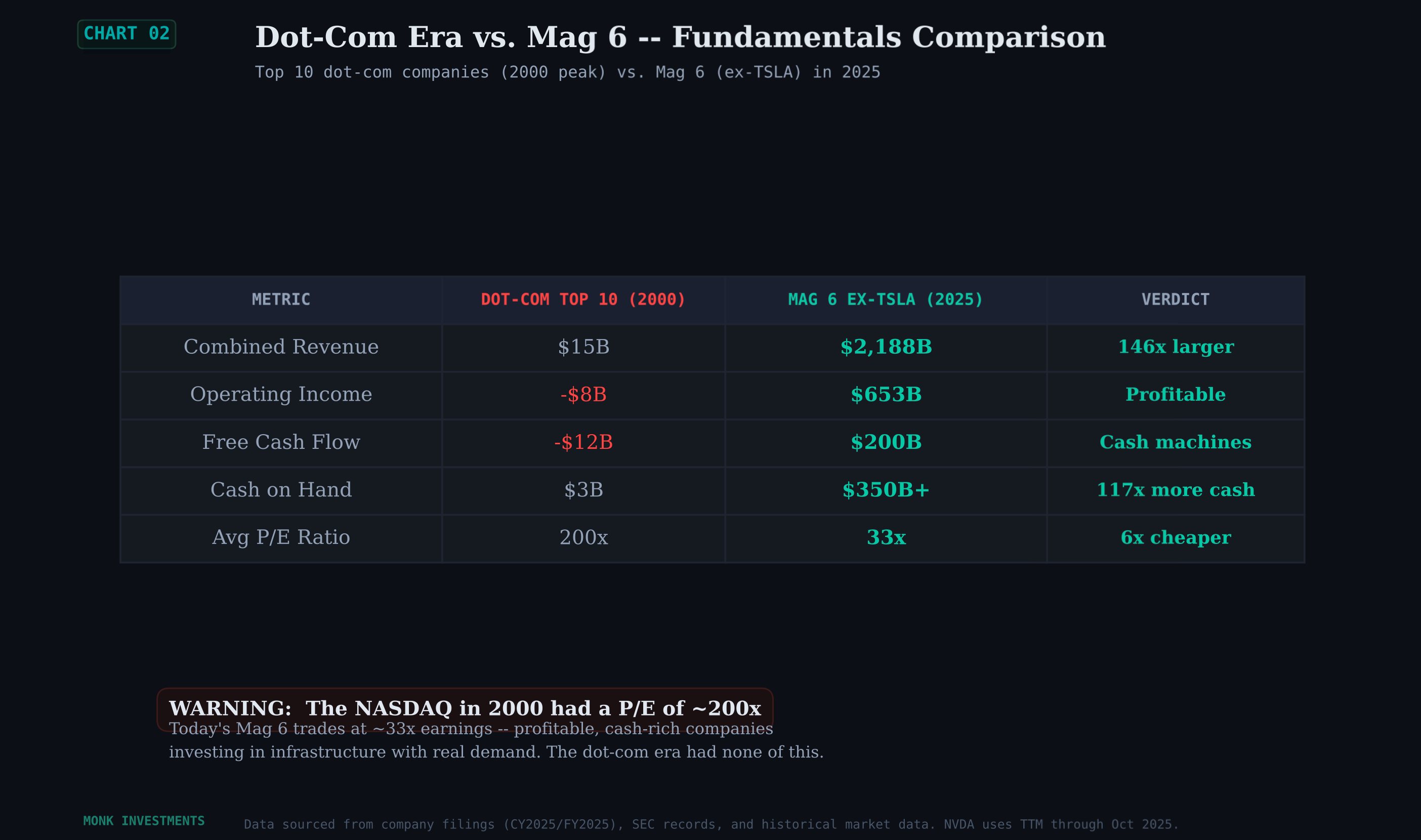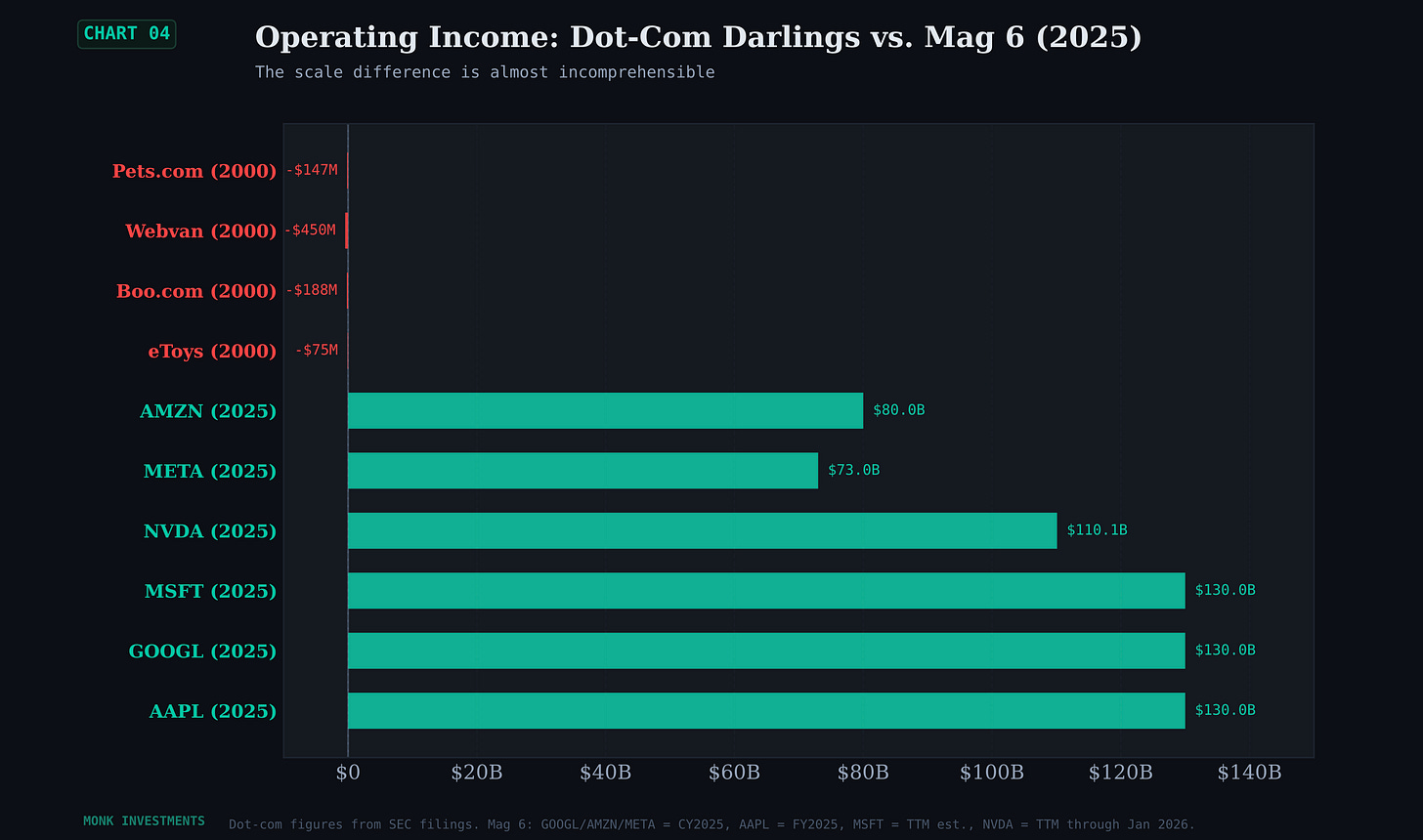Compare that to today: the Nasdaq sits around a 32x P/E. The Mag 6 collectively generated ~$2.19 trillion in revenue and ~$653 billion in operating income in 2025.